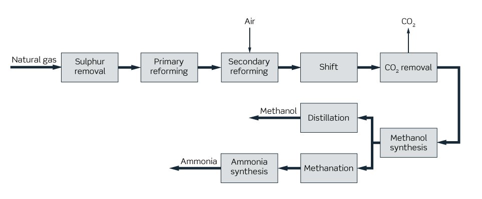 IMAP Ammonia+™ design employs our “in-line” ammonia methanol concept, where methanol synthesis is a once-through process under high pressure for maximum conversion and efficiency. The design can also accommodate our flexible skid-mounted UFC85 urea formaldehyde unit to create a fully integrated solution at fertilizer complexes. With this process design, ammonia is the main product and methanol is the co-product (up to 35%). The design is used for grassroots plants and revamps of existing plants, especially where there is local demand for small amounts of methanol, or when methanol prices are comparatively favorable. When no methanol is needed, this part of the process is simply bypassed.